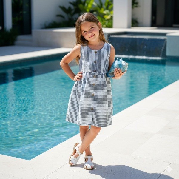 VESTIDO LINO RAYADO BLANCO Y azul CON BOTONES