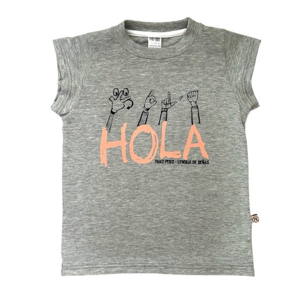 REMERA DE ALGODÓN GRIS MELANGE CON HOLA EN LENGUA DE SEÑAS ARGENTINA
